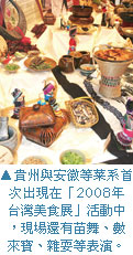 比起過去,2008年台灣美食展更有5項特色,如第一次出現貴州與安徽等菜系,屆時現場除了展示,還有試吃與限量展售,搭配苗族男女的歌舞表演,讓攤位熱鬧滾滾,少數民族風情濃厚,安徽菜色以「洪武宴」為主軸,讓歷史典故融入菜色之中,全套的菜色詮釋朱元璋精采一生。第2個特點為景點與美食相互結合,響應交通部觀光局的「旅行台灣年」活動,特別規劃屏東大鵬灣地區與溫泉美食特展區,參觀遊客從展場中可認識並品嘗海洋美味與溫泉健康佳餚。