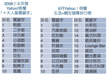在日前Yahoo!奇摩所公布的2008上半年10大人氣關鍵字排行榜中,旅遊相關關鍵字就佔了3個,包括「旅行社」、「宜蘭民宿」和首次進榜的「高鐵」,分別位居第6、8和第10名。而若從與生活息息相關的吃喝玩樂排行榜中看,「小吃」與「汽車旅館」分別位居排行榜1、2名,顯示消費者對於美食和住宿的需求十分強勁。