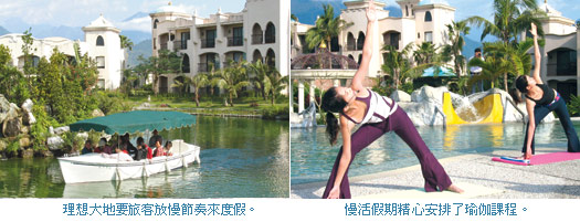 相信很多人都有經驗,出去度假本來是要放鬆身心的,但往往出遊2天,回家卻要休息3天,才能恢復體力,這就是傳統「走馬看花」的度假方式;理想大地的「時尚慢活」假期,就是希望擺脫舊思維,因此,特別將度假村營造成一個緩慢城市,要旅客來此度假一切都慢慢的,內容規劃上,也就別出心裁了安排瑜伽、鮮食套餐、輕艇遊河及多條健康的慢走行程。