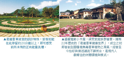 佔地3公頃的「君達香草健康世界」,度假中心設有雙人~6人房型,客房內一系列的香草用品與精油,讓花香漫延至小細節,而寬敞溫馨的8人小木屋,四周栽植季節香草,極受家庭歡迎,入住旅客上半夜只管開著窗戶,享受微風帶來的清新氣息,無需擔心蚊蟲侵擾,徹頭徹尾舒放在香氛迷瀰自然節奏中。