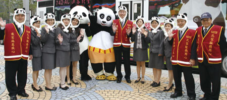 為了便利市民前往台北市立動物園,台北客運特別將現有的捷運接駁公車綠1線(新店—動物園—市政府)打造成貓熊公車,台北客運總經理李建文(圖右6)指出,搶搭可愛貓熊來台話題,特地把6部公車內外部彩繪、裝飾成貓熊造型,再強調以鮮明的企業形象標識及優良的服務,促使更多市民搭乘公車前往動物園觀賞。行駛時間自2008∕12∕26起,預計3個月,再視市場需求增減班次,同時,凡搭乘貓熊公車的乘客,都可獲贈貓熊糖果乙顆。