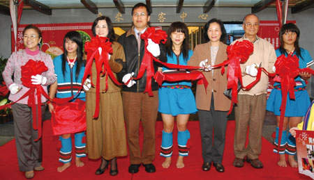 ▲ 台北縣政府旅遊觀光局局長秦慧珠(左3)與烏來鄉觀光發展協會理事長高淑敏(左1)、台北縣議員王建章(左4)、烏來鄉代理鄉長黃麗足(右3)、烏來鄉溫泉發展協會榮譽理事長林茂英(右2)共同主持落成剪綵儀式。