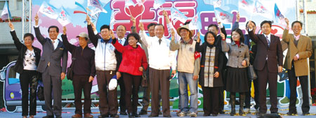 ▲ 經濟部長尹啟銘(前排著白夾克者)率領各商圈代表宣布「幸福巴士GO」活動正式開始。