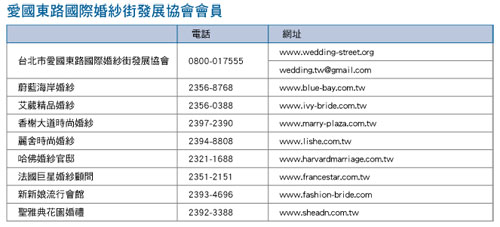 愛國東路國際婚紗街發展協會理事長伍珮綺表示,協會2004年成立以來,就以推動台灣婚紗業為主要的使命,同時,積極與旅遊業合作,多年持續帶領業者會員到國外參加婚紗展與旅遊展,期盼結合台灣的觀光景點,透過婚紗或寫真的拍攝,讓台灣的好山好水與獨特文化,進一步介紹給國外的旅人,讓台灣觀光的優勢更被彰顯。