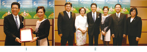 1. ANTOR外國駐台觀光代表聯誼會會長楊春玉(右)代表新任委員領取聘任證書,由 ITF主任委員嚴長壽頒發。