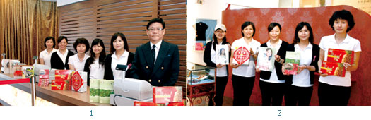 1. 如航空劃位櫃台般的收銀台區,讓旅客可井然有序的付費,開心把伴手禮帶回家。傳統伴手禮孫經理(右1)及櫃檯服務人員。