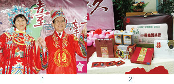 1.台南市長許添財(右)特別穿上古式新郎服、迎娶夫人洪淑貞,讓「2010台南牽手.幸福久久」宣傳活動更精采。
