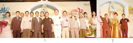 2.北觀處首推「第六屆北海岸婚紗留倩影攝影比賽」,北觀處處長朱傳緯(左)、台北縣八里鄉公所代理鄉長陳清海(右)與創意婚紗模特兒同台走秀。