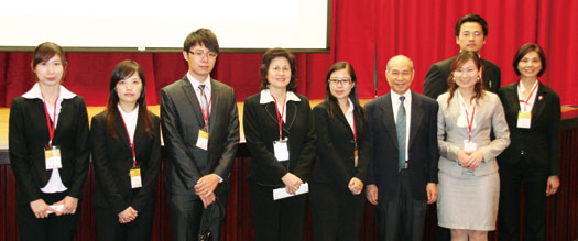 ▲海峽兩岸台北旅展大會工作團隊,(左起)會議組陳姿樺、交易會組蕭瑀涵、公關組張仲宇、執行長左郁文、交易會組長丁語純、入口組長曾玉健、公關組長陳映廷、展覽組長湯擷嘉、總務組李慧敏。