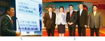 2.H.I.S. 社長平林朗(中)與(左起)高雄餐旅大學校長容繼業、觀光局局長賴瑟珍、雄獅旅遊董事長王文傑、康福旅行社總經理吳守謙在交通部觀光局「2010台灣觀光論壇國際大師開講」首場演講後合影。