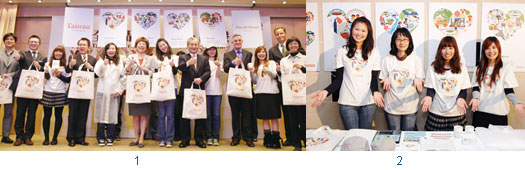 1.台灣觀光新品牌「Taiwan-The Heart of Asia」啟用儀式,由交通部長毛治國(前左8)、觀光局長賴瑟珍(前左6),以及國內觀光旅遊業代表共同揭牌。2.配合台灣觀光新品牌的推出,未來觀光局擬規劃一系列週邊商品,此次的心型圖案Logo更是大受好評。