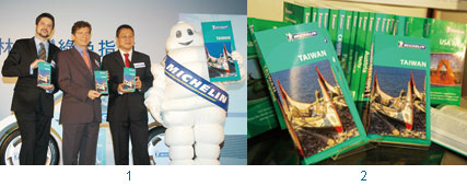 1.米其林忠欣公司總經理陸惠峰(右)、米其林大中華區旅遊指南經理傅奕誠(左)與法國在台協會主任包美城,向大家推薦《米其林台灣綠色指南》。2.《米其林台灣綠色指南》即將在4╱1起正式上市。