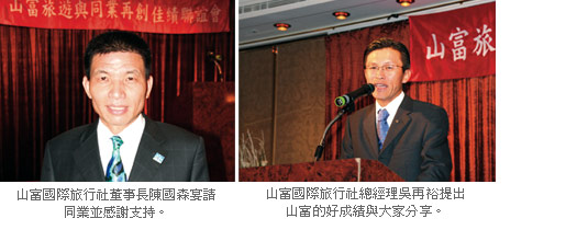 陳國森首先感謝同業百忙之中撥冗出席,他指出,山富更許久未舉辦大型同業聯誼會,此次舉辦餐會的目的是與同業話家常、聯絡感情,山富也藉以表達對同業長久支持的謝意,因為山富創建25年來能獲得同業好評,同業持續送客無疑是一大助益。吳再裕則表示,今年上半年度與去年同期相比,出團量足足成長500團,表現相當亮眼,其中日本方面維持每個月100團、大陸方面維持每個月300團的好成績。