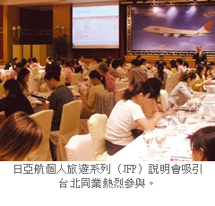 日亞航個人旅遊系列(JFP)說明會日前在台北舉行,吸引超過200位同業熱烈參與,日亞航票務聯誼會會長丁萊指出,JFP推出15年來已經獲得17萬人次的肯定,飯店選擇極為多元且組合靈活。