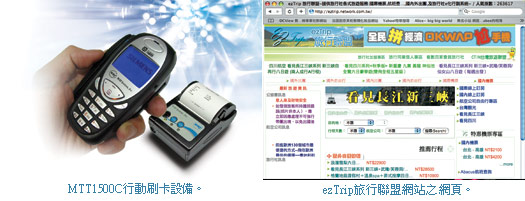 另外,8月分凱行旅行社剛與台新銀行完成簽約合作,已經可正式上線使用此套機制。在費用方面,手機費用與一般無異,刷卡資料傳輸是採用GPRS,授權交易可在5秒鐘內完成,資料傳輸採檔案K數大小收費,1K費用約0.2元。廠商目前是與中華電信合作,著眼於在國際漫遊上最為廣泛,因此帶著此機器前往大陸談生意,成交後可直接刷卡,而每筆資料傳輸費用+國際漫遊費,也僅需約0.8元,非常划算。此產品另一個好處在於,有權限的使用者,都可透過網路系統清楚了解到每筆消費,不會有帳款不清楚的情況產生。