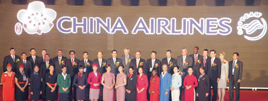 ▲華航於9/28正式加入天合聯盟,總統馬英九也親自到場祝賀。(左9起)華航集團董事長張家祝、總統馬英九、天合聯盟主席Leo van Wijk、天合聯盟執行董事Michael Wisburn、華航總經理孫洪祥。