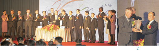1.在15家會員航空公司代表的見證下,華航總經理孫洪祥(前右2)與天合聯盟執行董事Michael Wisbrun(前左2)完成了入盟簽署儀式。2.華航董事長張家祝(右)與天合聯盟主席Leo van Wijk互贈紀念品。