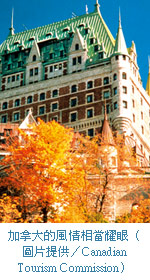 以加拿大來說,最漂亮的賞楓區在東岸,以加東四大名城─多倫多、渥太華、魁北克、蒙特婁為主,紅葉染滿山頭,跟加西以黃色變葉木為主的秋色完全不同。操作加拿大賞楓團十餘年經驗的洋洋旅行社,今年又有新變化,要以「登雙塔.宿城堡.阿岡昆.火車情」為訴求,給遊客一趟溫情奢華的「加拿大戀戀楓情10日遊」。