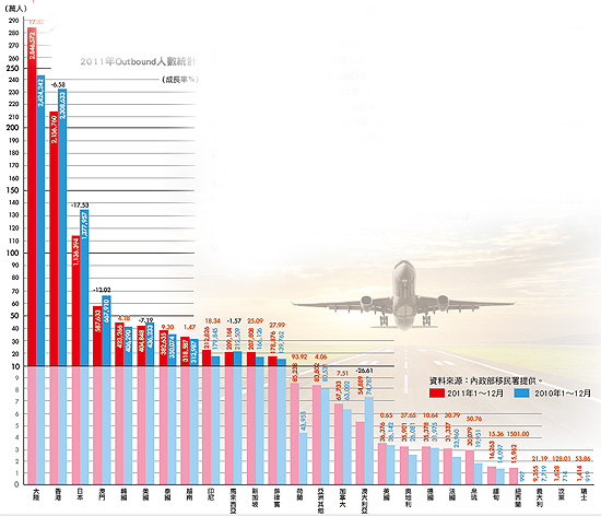 根據交通部觀光局的統計, 台灣2011年Outbound總人數達到958萬3,873人次,相較於去年的941萬5,074人次,微幅成長1.79%,前十大旅遊地點為大陸、香港、日本、澳門、韓國、美國、泰國、越南、印尼、馬來西亞。