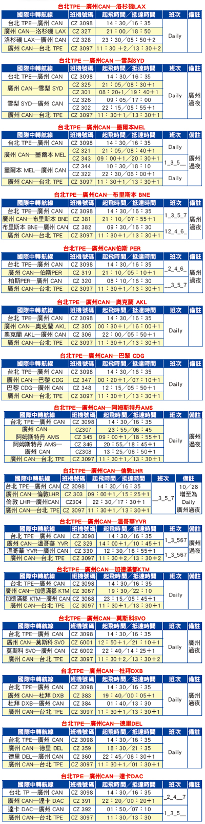南方航空所提供的國際中轉航班有巴黎、溫哥華、伯斯、伊斯坦堡、紐西蘭、雪梨、墨爾本、布里斯本、洛杉磯、巴黎、阿姆斯特丹、莫斯科、杜拜、達卡、加德滿都、馬爾地夫等全球數十個國際城市。便利的空中網絡與優質的服務,也促使各航線銷售成績亮眼,尤其在澳洲、歐洲、美加等航點,表現最為突出。其中,澳洲航點由原先一週7個航班,增加至40幾個航班,目前以廣州中轉澳洲最為便利,一週達27班。今年6╱6開航倫敦,並將於 10╱28增至為Daily航班。