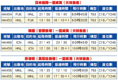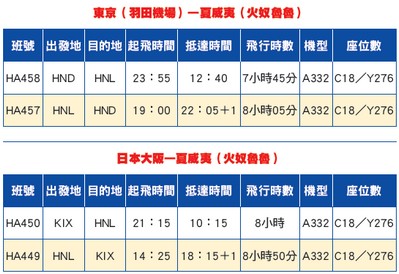 夏威夷航空(Hawaiian Airlines)是美國第11大商業航空公司,同時也是夏威夷最大的航空公司,主要營運中心為夏威夷檀香山國際機場,每年載客量約為800萬名乘客,飛往全球20個據點和跨太平洋國際長途航線,包括夏威夷、日本、韓國、菲律賓、澳洲、美屬薩摩亞、大溪地等等。隨著台灣獲選為美國免簽證候選國,加上因應亞洲國際線航班發展迅速,夏威夷航空也在亞洲航班佈局上,開發出多條長程航線,中途以日本與南韓作為中轉,讓旅客前往夏威夷與美國境內有更多元化的選擇。