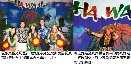 台北國際旅展常客夏威夷觀光局,今年請到專業呼拉舞者於現場演出,並以由夏威夷觀光局亞洲代表施春庭親自設計的大型舞台吸引全場目光。該舞台最大特色在於擁有一個不時會噴發火山的造型火山口為主,火山底端則是相當於2個攤位大的舞台區,包括呼拉舞者與美國館其他單位都可在此舉辦有獎徵答等活動,舞台下方則是夏威夷潔淨海域的海報,最具創意的地方則是以潔白細沙與貝殼鋪設而成的人造沙灘。施春庭說,火山與海洋是夏威夷最有名的兩大景點,因此他以此為出發,設計今年展台。至於舞者部分,雖非由夏威夷邀請而來,卻都是師乘夏威夷舞蹈大師的專業舞者群。施春庭希望透過現場輕快、活潑、悠閒的氛圍,將夏威夷舉世聞名的度假天堂場景搬到台北國際旅展現場,藉以吸引更多人前往夏威夷度假。