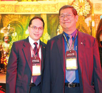 馬尼拉經濟文化辦事處觀光部觀光代表邦傑瑞表示,「於11/3旅展當天菲律賓與交通部首次簽署為期5年『備忘錄』,內容為積極推廣二國間的旅遊觀光和經濟投資計劃。此外,近一步與遠東航空洽談復航蘇比克航線,屆時,二國之間合作將更加密切。」圖為菲律賓觀光部次長Phineas Alburo(右)、馬尼拉經濟文化辦事處觀光部觀光代表邦傑瑞(左)。(撰文.攝影>呂雪芳)