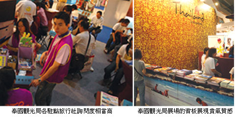 泰國觀光局,無論在表演節目的安排或是攤位的設計,所營造出的濃厚泰國味及歡樂氣氛總是台北國際旅展的注目焦點,今年,泰國館特別力邀世界最大劇場之一的泰國「繽紛暹邏劇場」(Siam Niramit)為攤位操刀設計,並邀請經常在世界各地巡迴演出的曼谷市WISE舞蹈團蒞臨現場演出各式舞蹈,更在現場特別料理泰國精緻美食,讓現場觀展民眾在五官上獲得最豐富的滿足感,並以「Thailand Unforgettable」訂為新年度的標語,今年共同參展的單位除了繽紛暹羅劇場外,還有龍城海鮮餐廳(Royal Dragon)、芭達雅五星級的皇家克里夫飯店(Royal Cliff Beach Resort)、及五家泰國「金品旅遊行程」業者。(撰文.攝影>林庭逸)