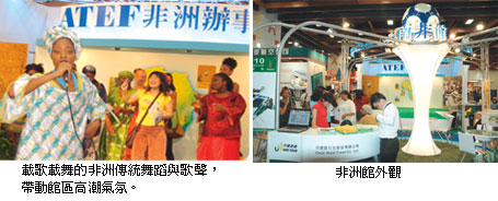 今年,非洲駐華經貿聯合辦事處非洲館攤位上展現5場令人驚豔的服裝秀。來自非洲的美麗模特兒們身著來自15個非洲國家的傳統服飾及珍貴珠寶飾品,帶來精采的走秀及舞蹈表演,並提供南非紅酒,非洲手工藝品,駝鳥蛋,動物木雕及2007非洲精美桌曆為獎徵答贈品,最大獎鑽石是極大賣點。(撰文.攝影>林庭逸)