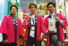 沖繩觀光局今年攤位以傳統除魔「沖繩招福獅」為主題做展示,藉以展現沖繩文化的另一面。(左起)沖繩TERRACE飯店銷售經理Andres Shimabukuro Chinen、沖繩觀光局台北事務所代表加藤新吾、沖繩觀光局台北事務所特別助理莊佳蕙。九州地區各縣今年亦採聯合參展形式,展場人員向民眾仔細解說九州地區的各項旅遊資訊,希望招攬更多台灣觀光客。