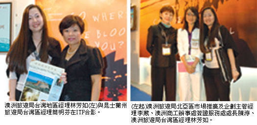 澳洲旅遊局今年強打「精采澳洲等你來!」,在ITF以10個展位來一展旺盛活力,除了聯合國泰航空、中華航空、長榮航空與澳洲航空等4家航空公司,並與數十家優質旅行社,合力主推精品旅遊,現場推出「全民大公投」活動,就是要台灣遊客體驗大堡礁、雪梨歌劇院和美食、美酒的魅力,並特別強調極限運動體驗和奢華時尚的行程,打造優質「澳」遊形象。