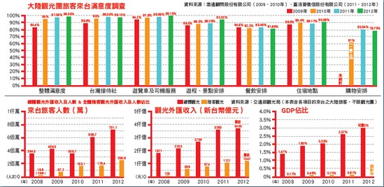 2008年開放兩岸直航後,陸客入境人次一年比一年高,成功讓觀光產業腳步大幅向前,2012年陸客來台人次達 258萬(含觀光、商務、醫美、參訪),放眼2013年觀光局也調整觀光法令,保障陸客團遊台品質,全面提升台灣觀光旅遊「食」、「住」、「行」、「遊」、「購」、「娛」素質,也讓「友善台灣」的稱號深存觀光客心中。