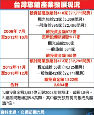 旅館商業同業公會聯合總會理事長徐銀樹表示,透過開放觀光飛快的發展,台灣旅館業就2011年與2012年之間成長了約 20%,其中2012年更是最為豐收的一年。台灣旅館業者更在設施、外觀拉皮、衛生安全、餐飲上做了教育訓練,尤其旅館服務人員的需求上,更挹注大量人力,也會針對入住地區的旅客提供當地料理,創造親切感,提供優質住宿品質。