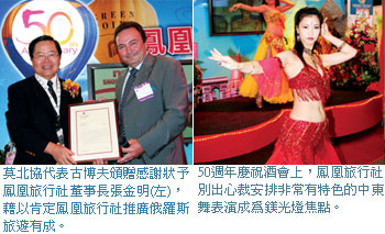 適逢今年50週年,鳳凰旅行社假旅展首日舉辦50週年酒會,酒會當日吸引多位航空公司業者、旅遊局代表與旅行業者到場祝賀,一時間,貴賓雲集,場面相當熱鬧,從中也看出鳳凰旅行社與合作夥伴們間深厚的合作關係。鳳凰旅行社董事長張金明致詞時首先解釋,之所以說「50年」,是從鳳凰前身亞洲旅行社算起,張金明感謝同業們長久以來的支持,才能讓鳳凰走過半個世紀的精采。值得一提的是,台北國際旅展開辦20年以來,鳳凰旅遊年年參加,從不缺席。而今年喜逢鳳凰50週年慶、台北國際旅展20週年慶,鳳凰更擴大舉辦、全體總動員,除邀請海外合作業者如Costa遊輪、俄羅斯駐台辦事處、俄羅斯駐孟買代表抵台參加盛會,酒會中安排極具特色中東肚皮舞演出,旅展期間更以吸引力十足的優惠瘋狂送與精采活動贏得滿堂彩。(撰文.攝影>曾瑋琪)