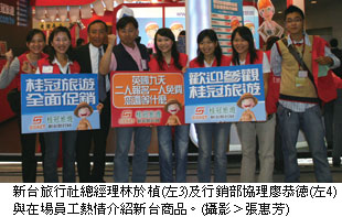 新台旅行社桂冠旅遊此次旅展活動以「您的世界.桂冠旅遊」為Slogan,並搭配各線的旅遊達人經理現身說法並現場大放送為活動重點,並有北海道、東京、大阪、福岡、法國、瑞士、英國、捷克等地區促銷行程,值得一提的是新台旅行社行銷部協理廖恭德親自於展場台上向民眾解說特惠行程內容。(撰文>呂雪芳)