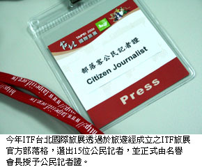 在ITF旅展展前記者會上,由旅遊經行銷總監查理王與幾位部落客代表上台授證,肩負起為期一年的台灣觀光親善大使的公民記者任務。