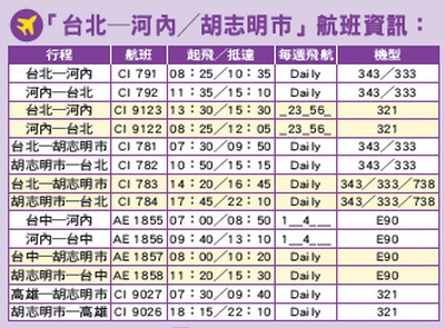 中華航空提供「台北─ 峇里島」Daily航班,以班號CI 771 由台北9:15起飛、14:20抵達,回程則以班號CI 772從峇里島15:30起飛、20:50抵達。早去晚回的時間最漂亮,並以空中巴士333執飛。而在中南半島的越南擁有河內、胡志明市兩個航點,其中胡志明市分別可從台北、台中、高雄直飛。另外,在柬埔寨的部分則提供每週二、五、六「台北─金邊」的服務。