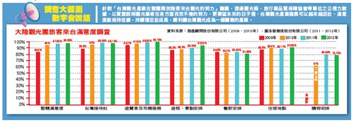 旅行商業同業公會總會理事長姚大光特別指出,從陸客來台開放後,觀光局也委託國際市調公司蓋洛普在機場出境進行調查,針對大陸觀光團旅客來台進行滿意度調查,在整體滿意度上,從2009年的84.4%進步至2012年的98.35%;旅行社整體接待品質上,從2009年89.9%進步到2012年98.13%;遊覽車與司機服務,從2009年94.2%進步到2012年 99.15%;遊程、景點安排從2009年 86.5%進步到2012年92.52%;住宿地點安排從2009年的88.6%進步到 2012年90.08%。