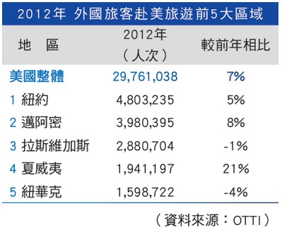根據美國商務部旅遊觀光辦公室(OTTI)的統計,2012年赴美旅客達6,700萬人次,較2011年成長7%,創造了約1680億美元觀光收益;台灣赴美旅遊市場長期以來成熟且穩定,2012年有近30萬人次赴美,在美國入境國家中排名第22名,今年在免美簽效益、華航及夏威夷航空增加夏威夷航線、長榮加入星空聯盟等眾多利多因素下,航班機位增加,市場話題不斷,赴美旅遊人次可望在第三季有所成長。