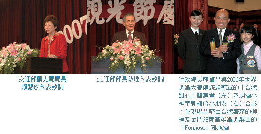 甫於去年上任的交通部觀光局長賴瑟珍首先於致詞時表示,在旅遊同業共同努力下,2006年台灣的Inbound觀光表現非常亮眼,今年共有350萬餘人次來台觀光;除了表達深切的感謝之意之外,也期勉在新的一年,能再接再厲創下更好的成績。觀光局將今年的來台目標總人次訂為375萬,希望能有更多人看見台灣這塊美麗的土地。而交通部長蔡堆也表示,交通建設是觀光業發展的堅強後盾,高鐵的營運更加縮短了南北間的距離,擴大一日生活及觀光圈的範圍,這對於觀光行程的規劃有著革命性的改變,在觀光蔚為風潮的今天,各地相關的觀光建設及服務更是刻不容緩。從發掘輔導在地特色、提升軟硬體服務品質到國內外行銷等,各項工作均需要環環相扣、由點而面,以建構健全的觀光旅遊網絡。