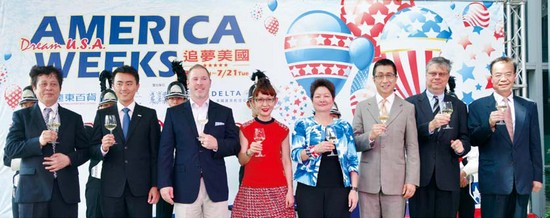▲(左起)遠東百貨營運長林彰豐、Brand USA美國國家旅遊局台灣香港代表處經理陳信甫、美國在台協會農業貿易辦事處主任MarkFord、遠東百貨總經理徐雪芳、美國在台協會商務組組長Ireas Cook、達美航空台灣暨韓國總經理張建仁、美國在台協會商務組商務官周瀚林、遠東百貨企劃長劉志成