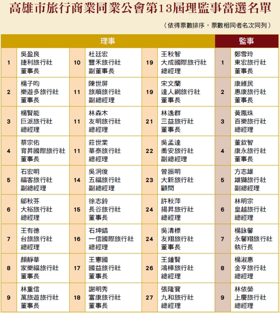 高雄市旅行公會現有會員人數424家,扣除選前因會員代表異動不具投票資格的10家,共有414家可參加投票,而投票現場親自出席者有 340家、書面委託者有71家,合計411家,其出席率與投票率均創新高,足見選戰激烈程度。