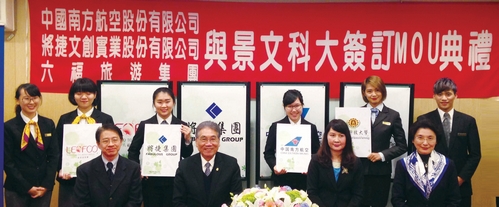 中國南方航空、六福旅遊集團、將捷集團3大觀光餐旅集 團代表於1/14在景文科技大學共同簽訂產學合作意向 書,未來3大旅遊業集團將與景文科技大學攜手發展產學合 作,提供學生企業實習與就業機會,藉此培育更多觀光旅遊產 業的專業人才。