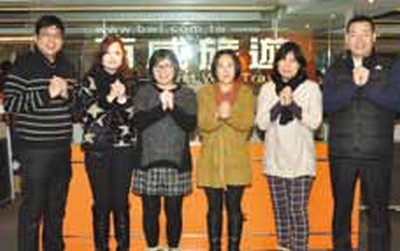 ▲(前排左起)百威旅遊日本韓國線控主任何雅倩、中區同業部副理張君華、台中分公司經理陳穩仁、港澳沖繩線控副理彭淑青(右1)。