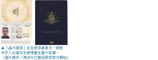 在國際民航組織倡議規範及美國政府強力推動下,全球已有超過30多個國家陸續發行「晶片護照」。利用高科技晶片儲存護照持有人照片等基本資料,再使用電子簽章加密方式保護,提升護照防偽功能,可有效防範護照遭不法冒用,同時也可加速通關。在亞太地區,包括香港、澳洲、馬來西亞與新加坡也都已經陸續採用「晶片護照」,並於邊境通關檢查點建置相關系統,加強國土安全。