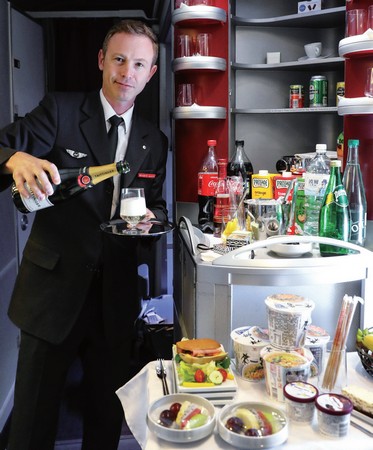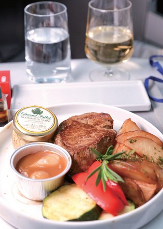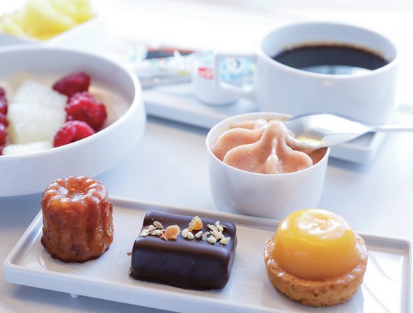法航採用波音777-200 執飛,共規劃了 商務艙、尊尚經濟艙及經濟艙3艙等,一 律香檳款待,從搭機那刻起,曼妙的香檳 氣泡已讓乘客彷彿置身巴黎展開旅行。不 僅如此,商務艙提供的餐點不論擺盤或口味,讓人像在高空的米其林餐廳享用法國大 餐。每個商務艙座位均為走道位,並採用隔 板打造專屬空間,座椅可從坐式調整成 180 度平躺的 2 米長大床,提供羽絨被與加大 XXL 尺碼的羽絨枕,讓人舒適如躺在自家床 上進行長途飛行。