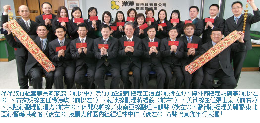 新春期間,洋洋旅行社一陣沸騰,為年節期間的滿團忙碌、為新的一年開始躍躍欲試,在一片歡樂聲中董事長韓家威率領陣容堅強的團隊與同業拜年,在熱情洋溢的微笑中,精神奕奕地邁向狗年的挑戰!