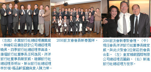 2005年旅遊市場整體來說,各家業者、航空公司、飯店等,都創下不錯的成績,雖然市場波動在所難免,如:油價居高上漲、利率調昇、兩岸旅遊政策不確定性;但相對的全球經濟市場更趨成熟、年輕人旅遊風潮商機無限、網路加速地球一家的觀念,從中細細分析之,相信都能發現廣大的旅遊契機。因此,2006剛開春的第一次旅友會聚會,所有參加會員都希望在金狗年激勵之下,以專業的市場操作,增進彼此的龐大利潤。旅友會第二屆會長韓家威就簡明的祝賀整個旅遊產業,「2006大吉大利,萬事都如意!」