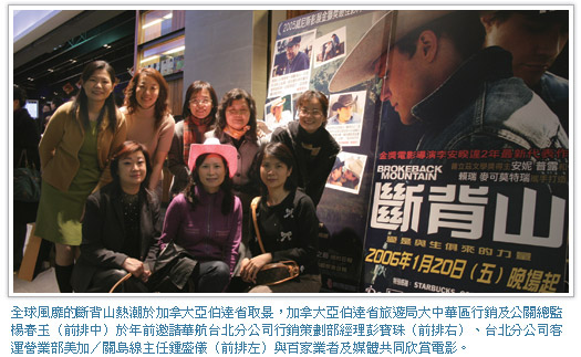 電影主題之旅風行,加拿大亞伯達省看準這股熱潮,加上獲得金球獎七項提名的「斷背山」就於亞伯達省多處拍攝,加拿大亞伯達省旅遊局大中華區行銷及公關總監楊春玉更指出,年底還有布來德彼特主演的The Assassination of Jasse James上檔,電影之旅將是今年亞伯達的重頭戲。