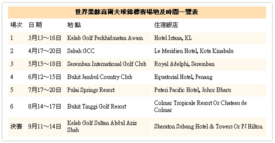 欲知更多業餘錦標賽的相關活動訊息,可電洽馬來西亞觀光局(02)25149704分機34 或傳真(02)25149973,地址為台北市敦化北路170號8樓C室。